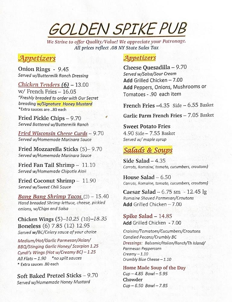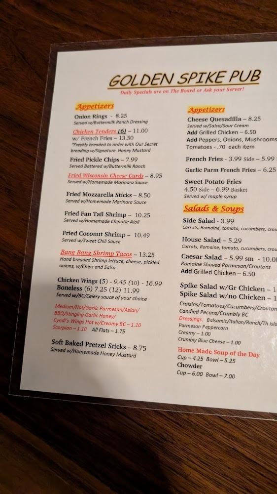 Golden Spike Pub's menu revolves around classic dishes with local flair. It dives deep into affordable comfort food. Popular items include chicken tenders, crispy wings, and tasty burgers. The fry baskets are a crowd-pleaser, with options like shrimp or fish. Variations of traditional favorites add creativity to each plate.